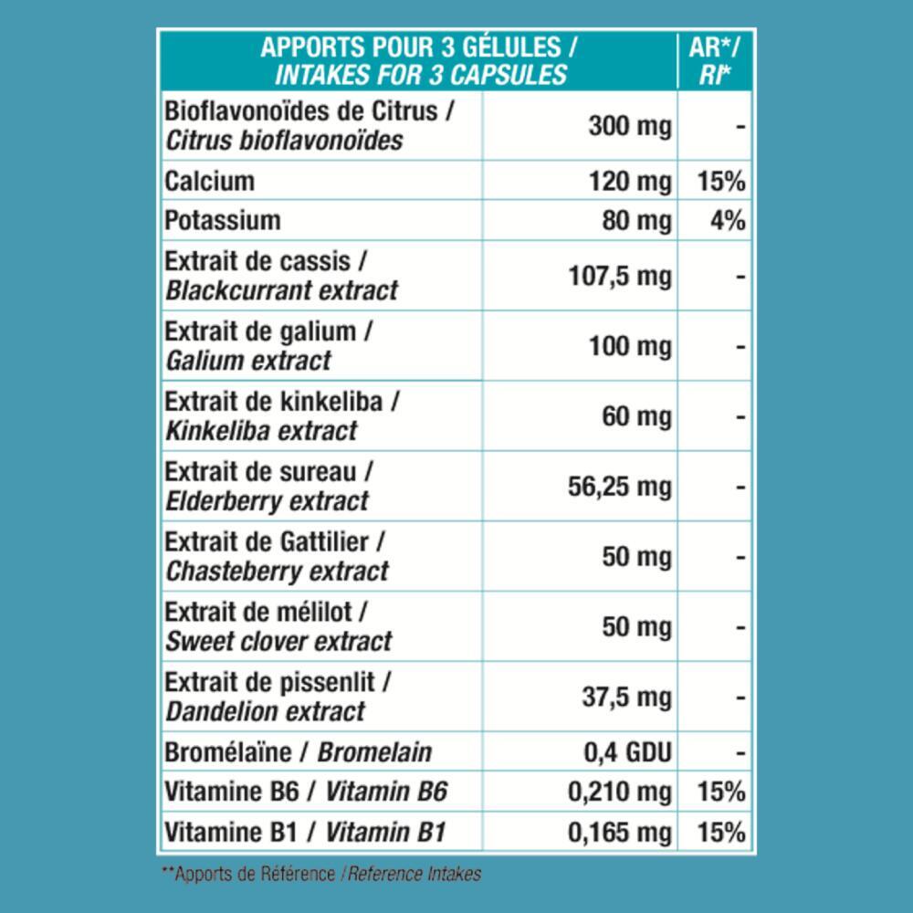CITRUS BIOFLAVONOIDS 50%; FILLING AGENT: MICROCRISTALLINE CELLULOSE, DICALYTIC PHOSPHATE; CALCIUM OXIDE; POTASSIUM CHLORIDE; CASSIS EXTRACT; GALIUM APARINE EXTRACT; ANTI-AGGRESSIVE: MAGNESIUM STEARATE; KINKELIBA EXTRACT; ELDERBERRY EXTRACT; CHASTE TREE EXTRACT; MELILOT EXTRACT; DANDELION EXTRACT; BROMELAIN; VITAMINS B6 AND B1. GELULE: HYDROXYPROPYLMETHYLCELLULOSE.