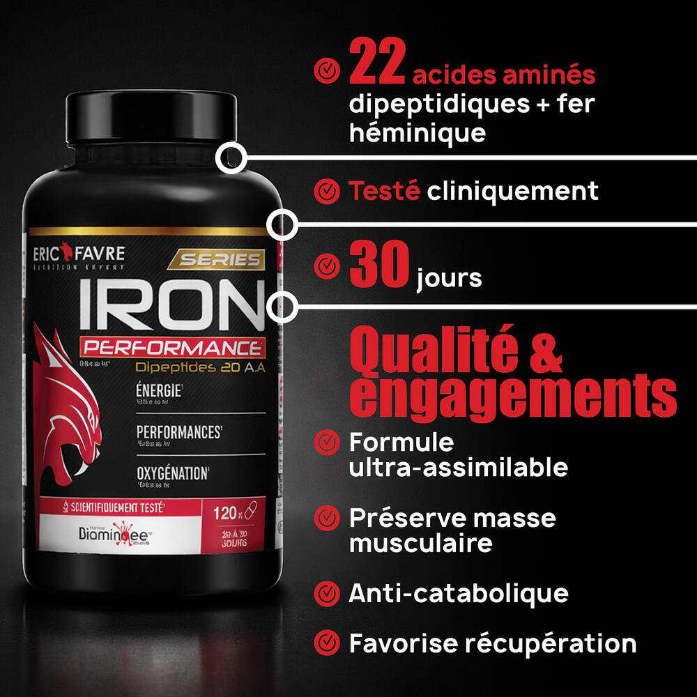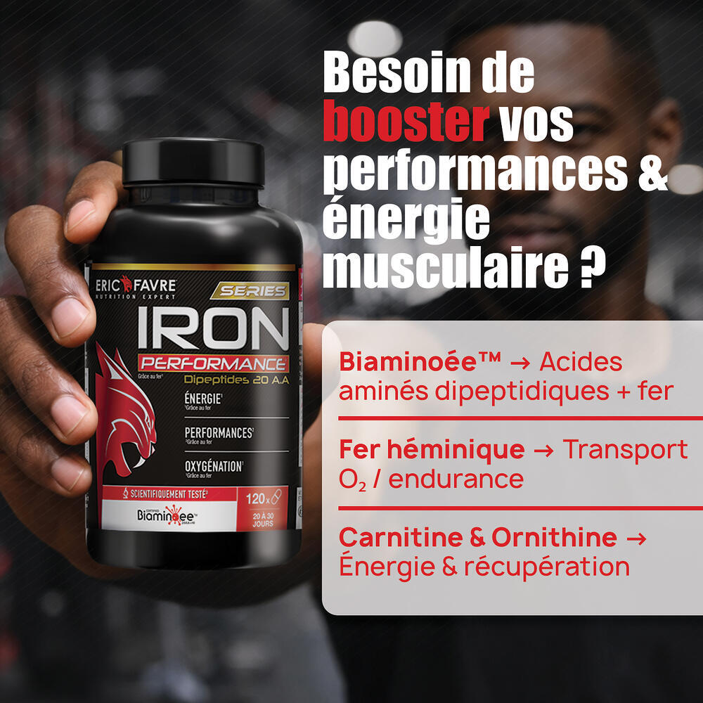 Avec Iron Performance E.A.A d'Eric Favre, profitez d'une formule exclusive Bioaminoée® Dipeptides associant 22 acides aminés essentiels et fer héminique pour maximiser vos performances sportives. Cette combinaison unique soutient efficacement la synthèse protéique musculaire, accélère la récupération post-effort et optimise l'oxygénation cellulaire pendant vos entraînements intensifs.